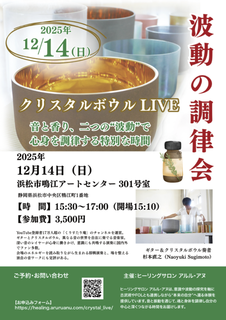 今回は特別ゲストとして、アロマセラピスト 吉田洋子さん をお迎えし、会場全体を“香りの波動”でプロデュース。音と香りが重なり合う、年末にぴったりの調律の時間をお届けします。
